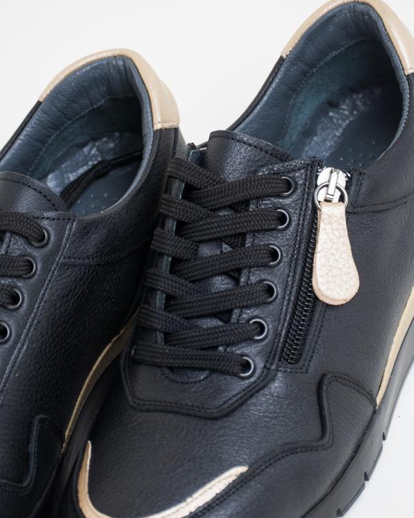 Végül itt egy a Via Roma cipő. Ahol szintén adott a kontraszt. Viszont itt fordított a helyzet. Ennél a cipőnél fekete alapra került az arany díszítés. Ami természetesen kicsit sincs túlgondolva. Annak ellenére, hogy a cipő orrán, a talpon, a saroknál és a cipzár fülön is megjelenik a csillogó díszítés, megmarad a minimál stílus.