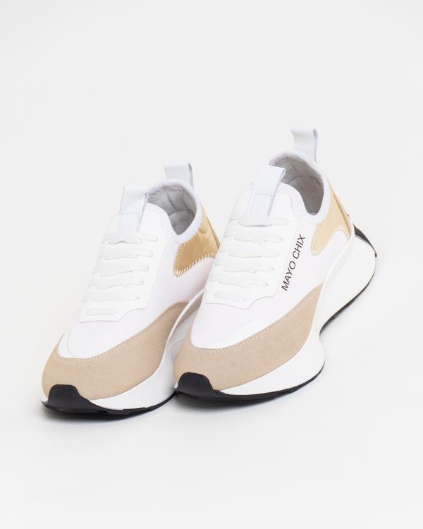 Akárcsak ennél a Mayo Chix cipőnél. Ezen a sneaker-en oldalt jelenik meg a csillogó arany elem, amit egy fehér alapra került bézses díszítés egészít ki.